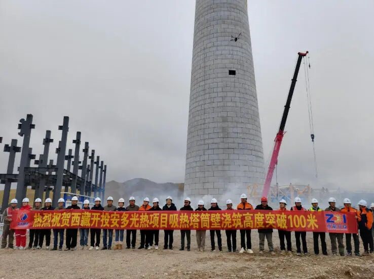 At 12:00 on September 21, the core structure of the solar receiver tower at the world's highest-altitude tower CSP plant—Tibet Kaitou Anduo County Tushuo 100 MW CSP Project—successfully reached the 100-meter elevation milestone. Located in Anduo County, Nagqu City, Tibet, the tower employs a hollow, thin-walled reinforced-concrete shell design with a total planned height of 185 meters. Completion of the 100-meter lift marks the project's transition into the most critical phase of superstructure construction.