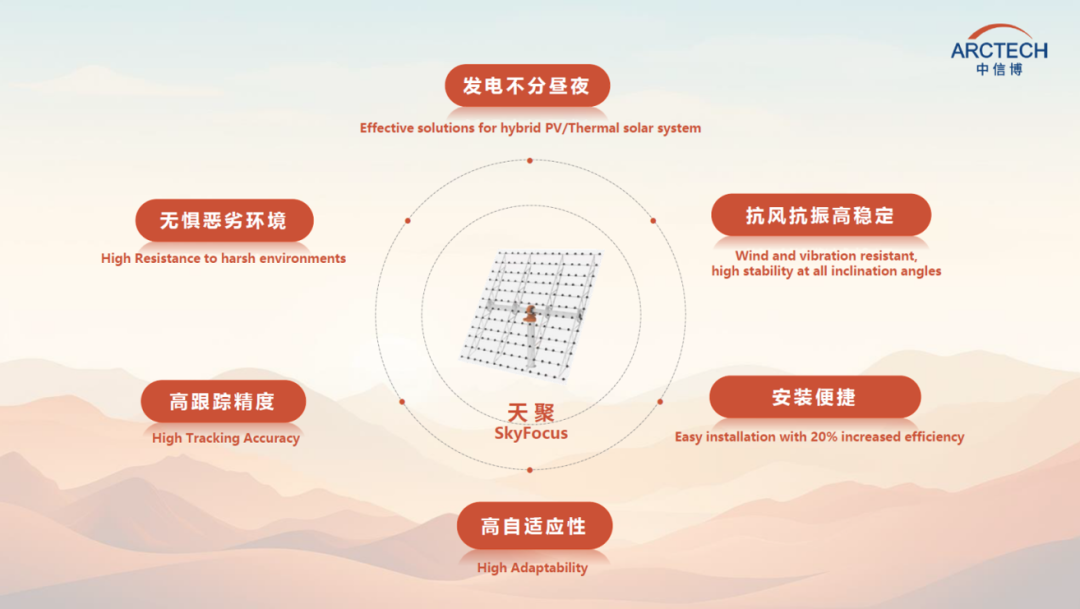 ARCTECH’s independently developed “SkyFocus” tower dual-axis solar thermal tracking system features high adaptability, high tracking accuracy, high stability, wind and seismic resistance, and strong wind protection. Its modular design improves installation efficiency by over 20%, significantly enhancing system stability and reducing O&M costs.