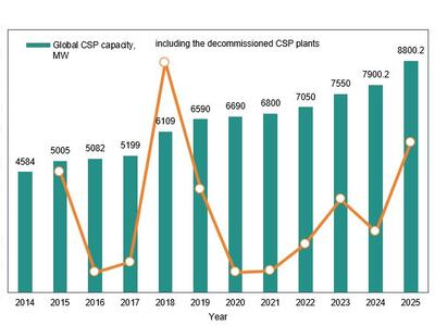 Figure: the cumulative installed capacity of CSP in major countries and regions worldwide reached 8800.2 MW (including 8 decommissioned trough power plants built in the United States in the 1980s), a year-on-year increase of 11.4%.